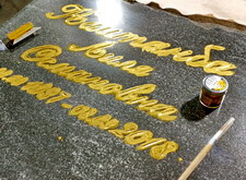 Переходим к созданию надписи. Вырубаем её на граните, затем покрывает акриловой краской. Такой вариант является отличной альтернативой покрытию сусальным золотом, который, к тому же, обходится клиенту значительно дешевле.